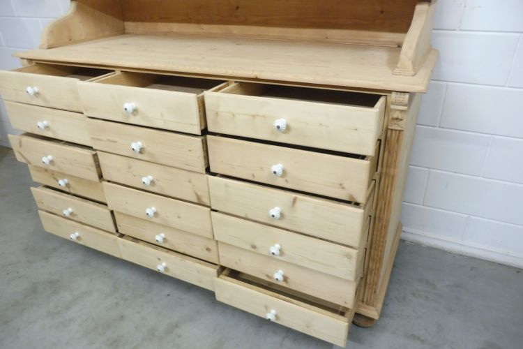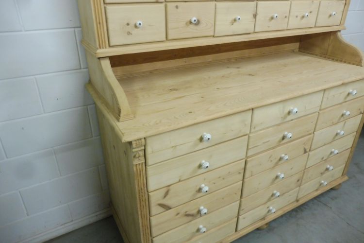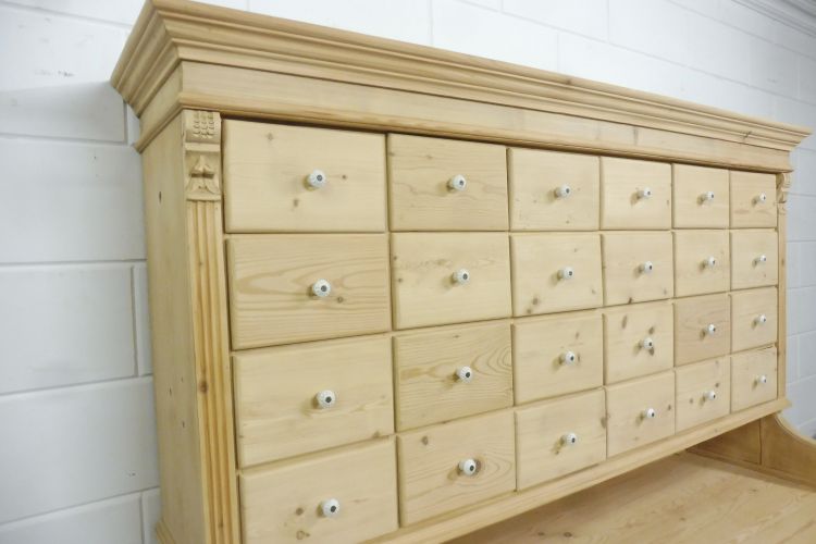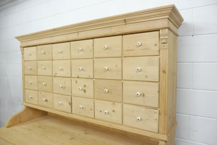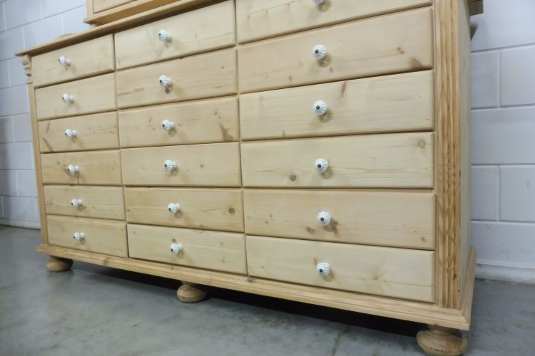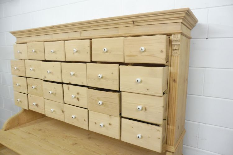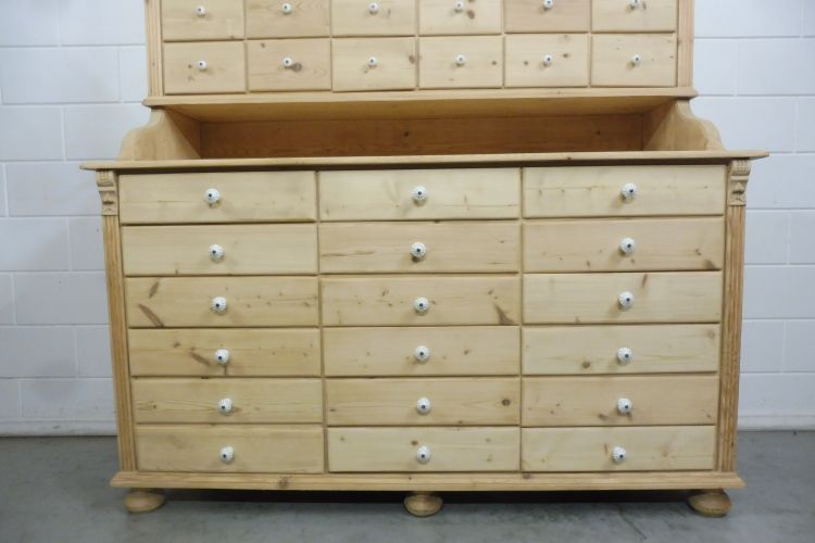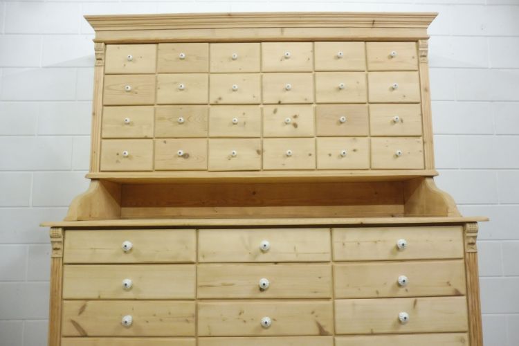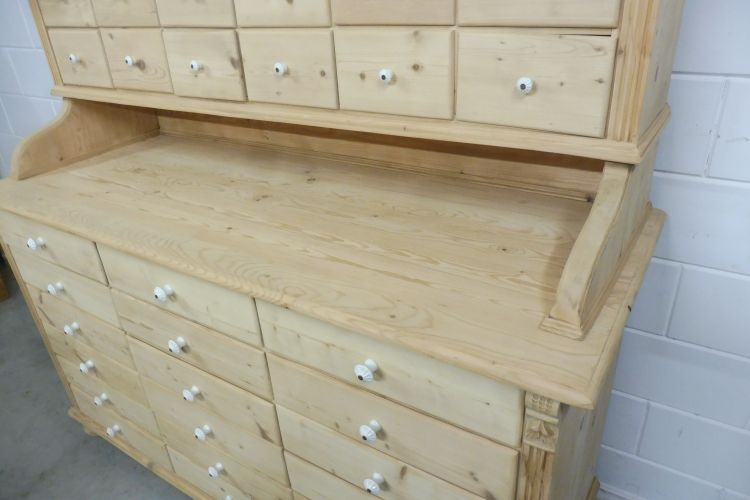 Beautiful Untreated Natural Pine Apothecary Cabinet Fully restored. Disassembles into 2 parts. Ready for immediate use. Upon request, we can treat this cabinet with wax. Height 193 cm Width 172 cm Depth 64 cm