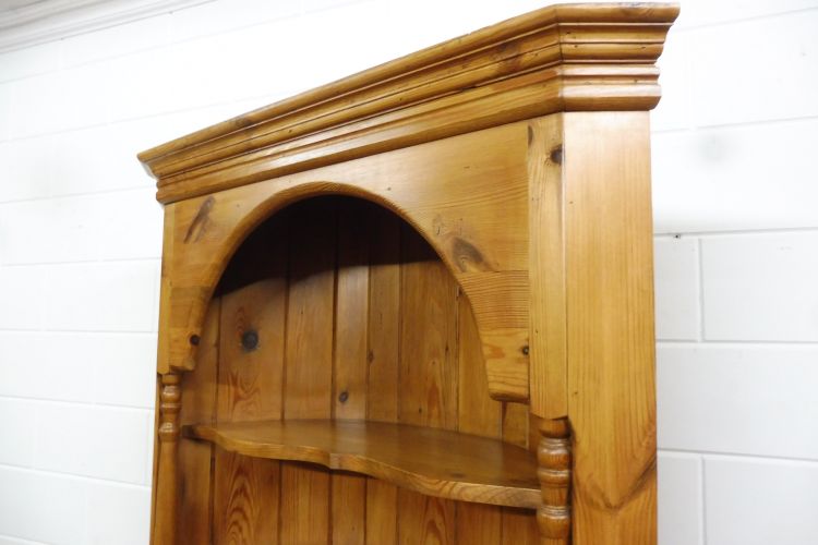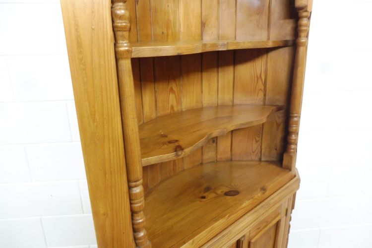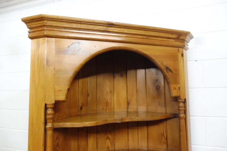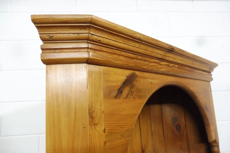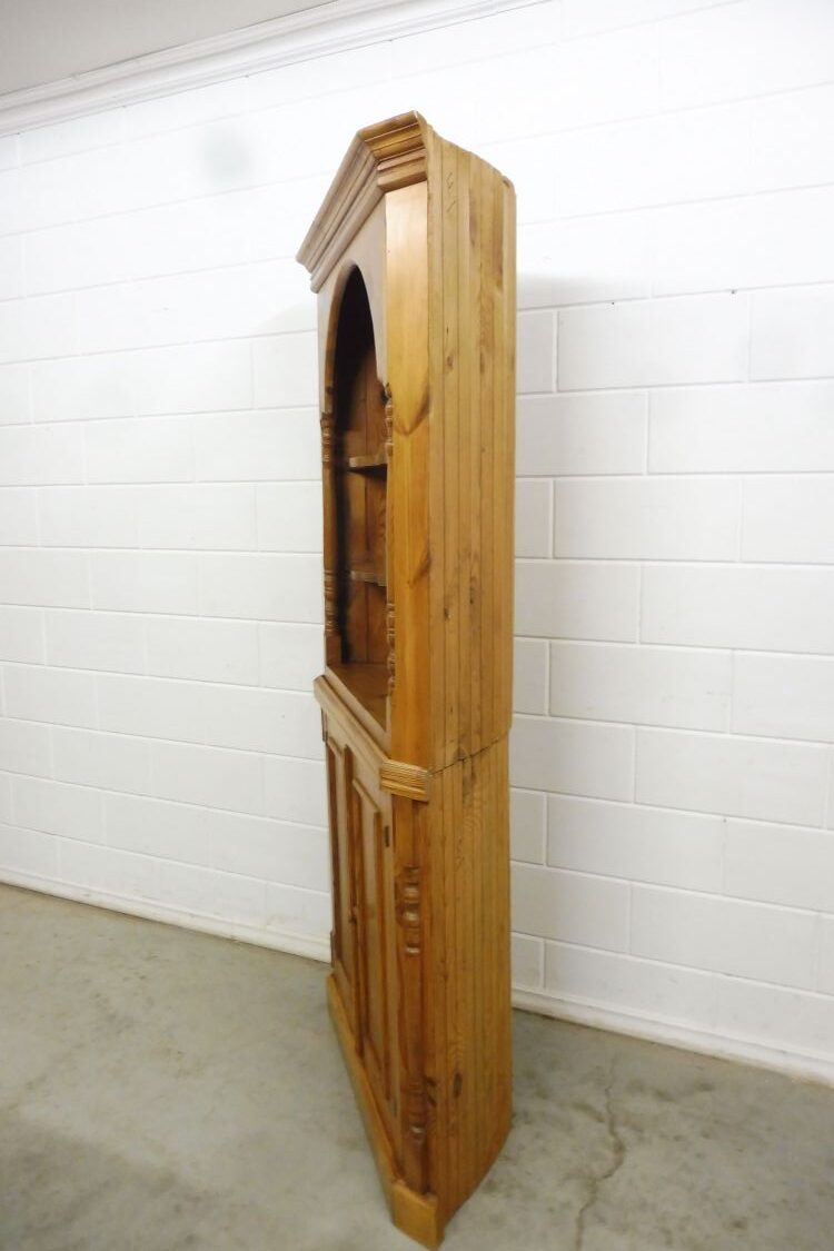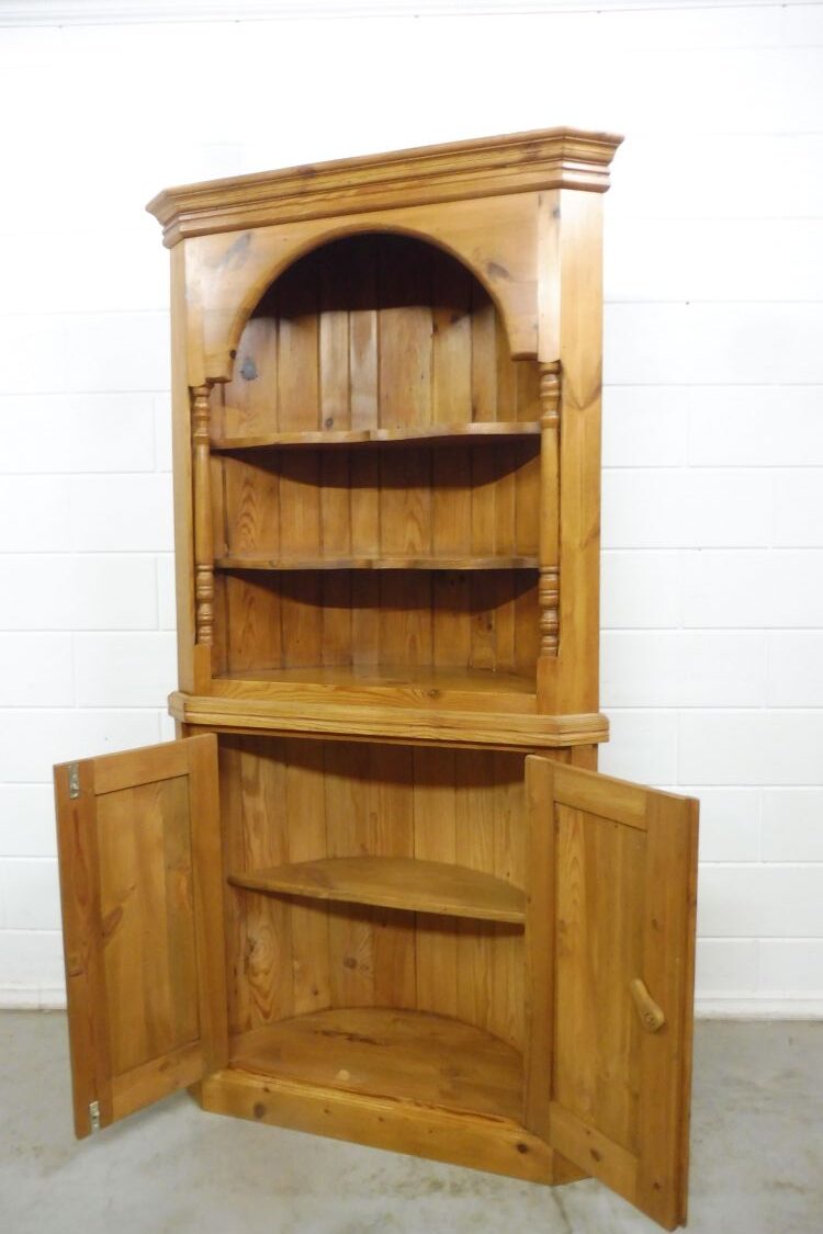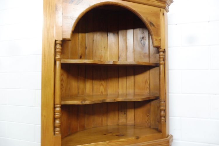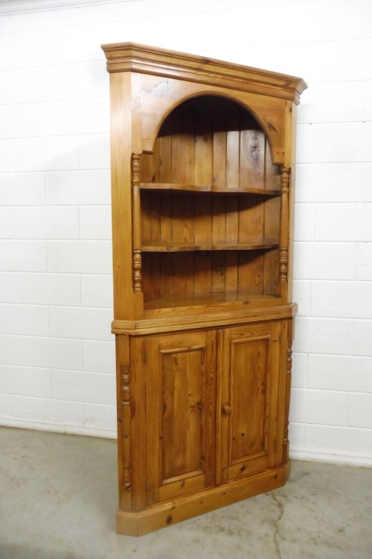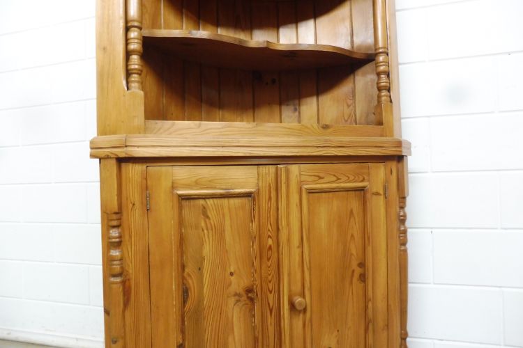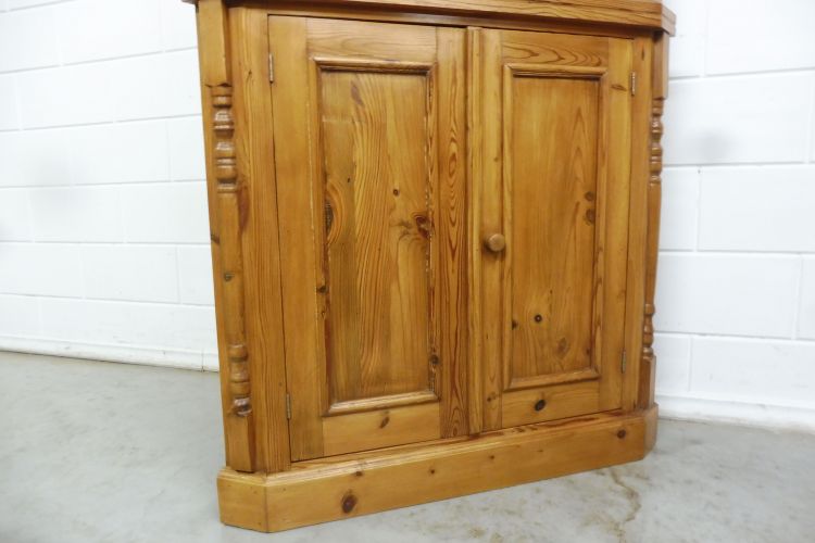 Country-style softwood corner cabinet. Restored and treated with wax. Dismantles into 2 parts. Ready for immediate use.
