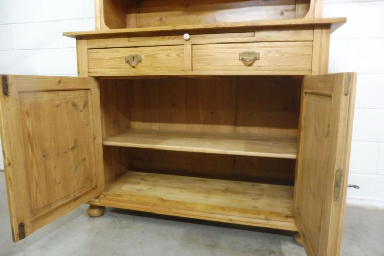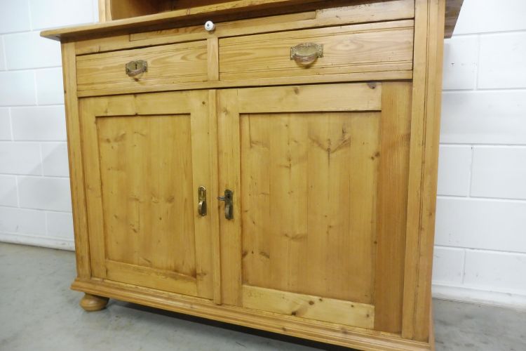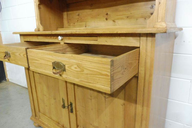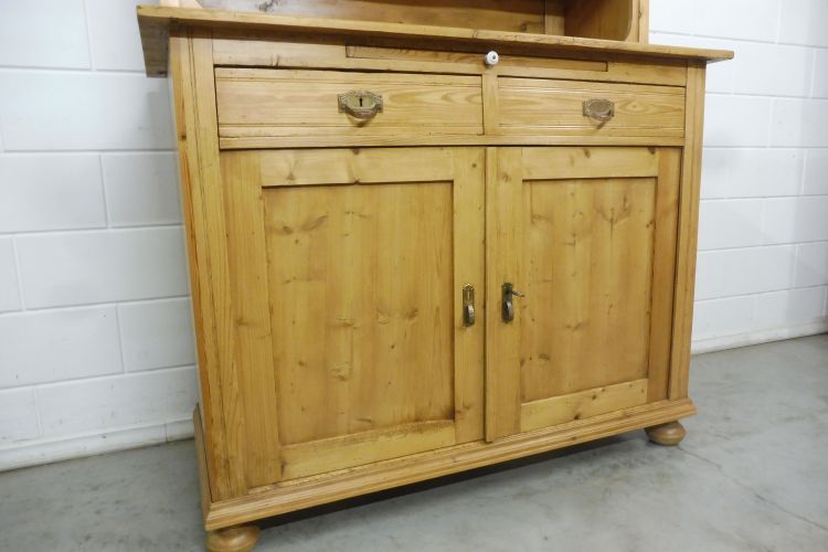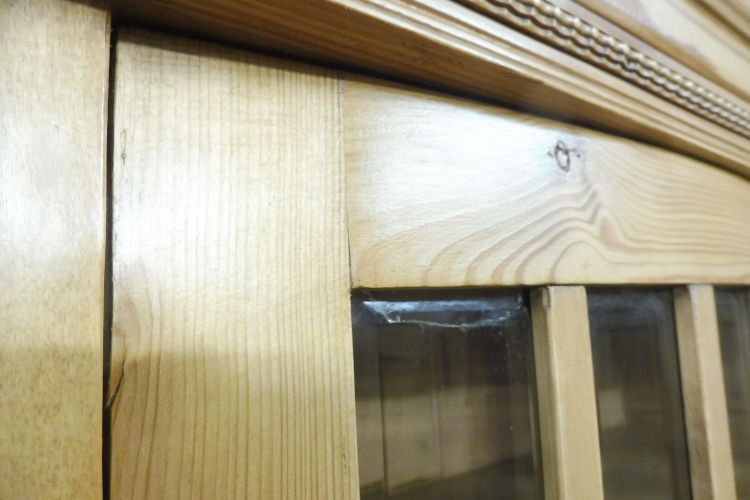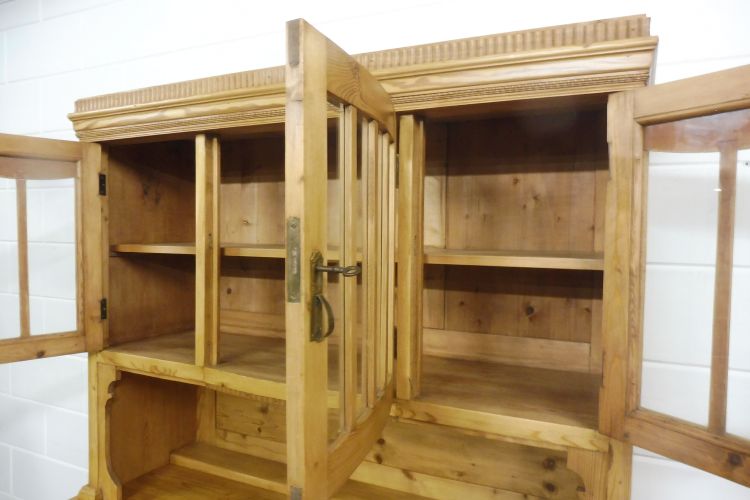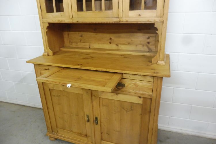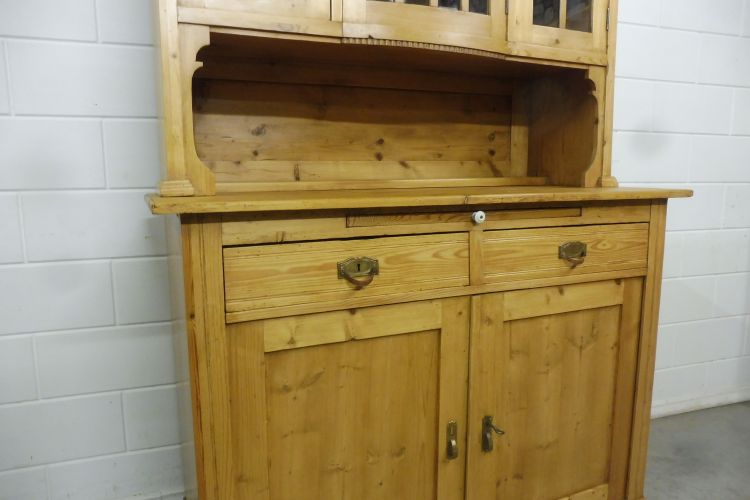 Mooie antieke grenen keukenkast in art-nouveaustijl, circa 1900. Gerestaureerd en behandeld met was. Demonteerbaar in 2 delen. Klaar voor gebruik. Let op: de glasplaat van de middelste deur heeft een kleine beschadiging; zie de foto’s.