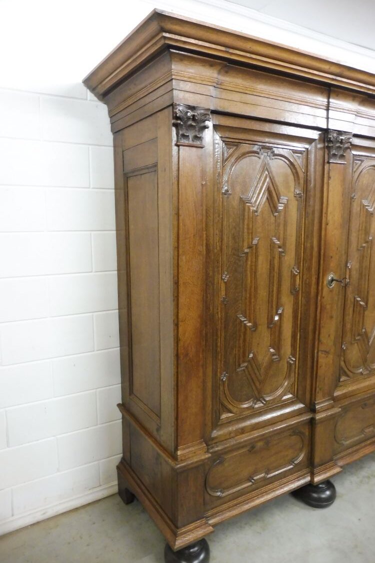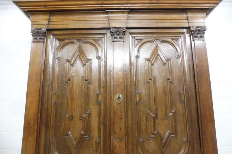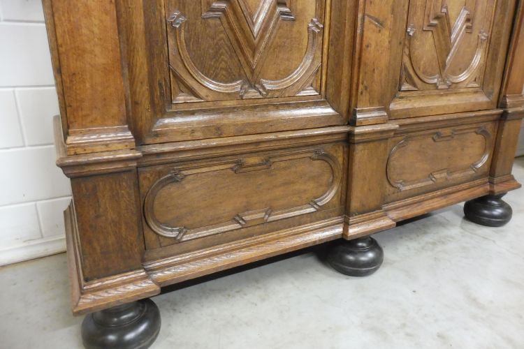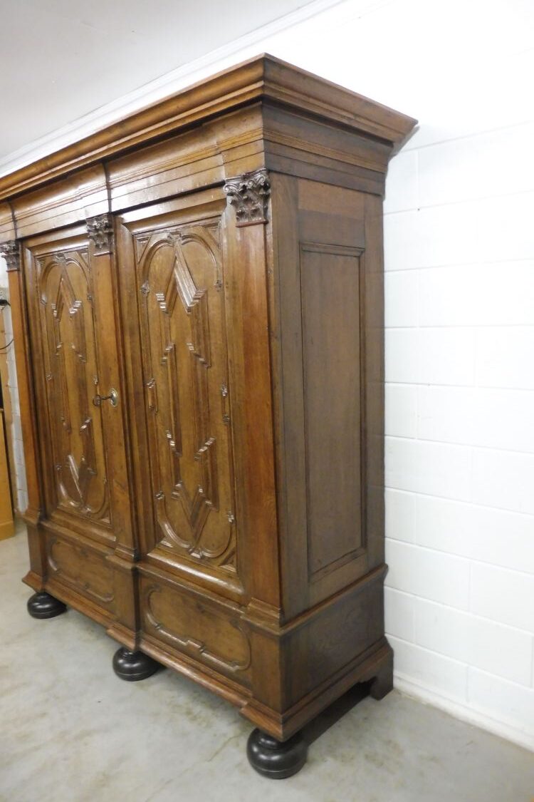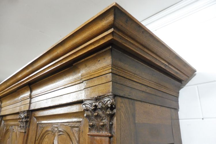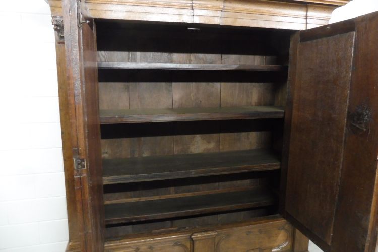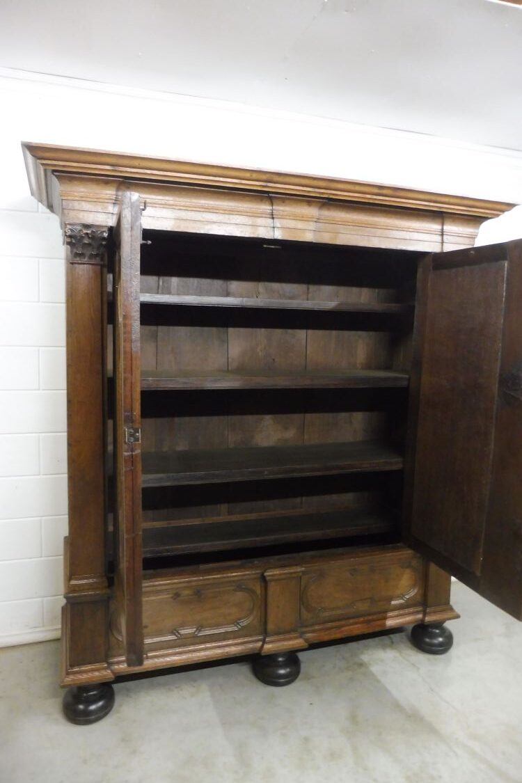 Zeer mooie antieke barokke kast van massief eikenhout ca. 1750. Volledig gerestaureerd en behandeld met was. Volledig demonteerbaar. Klaar voor gebruik. Door de leeftijd vertoont de kast enkele gebruikssporen. Hoogte 211 cm Breedte 201 cm Diepte 74 cm Binnen diepte 46 cm