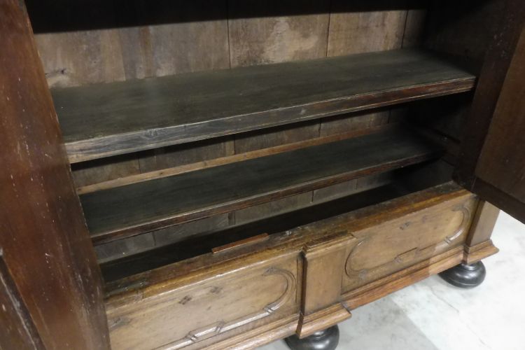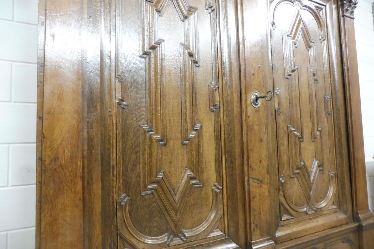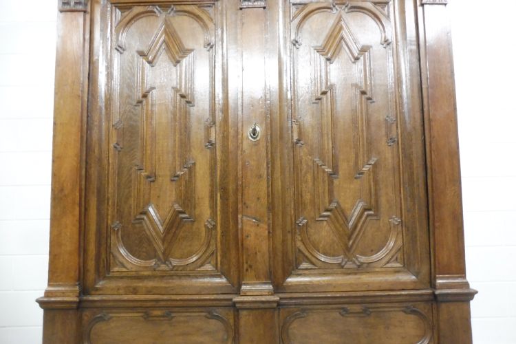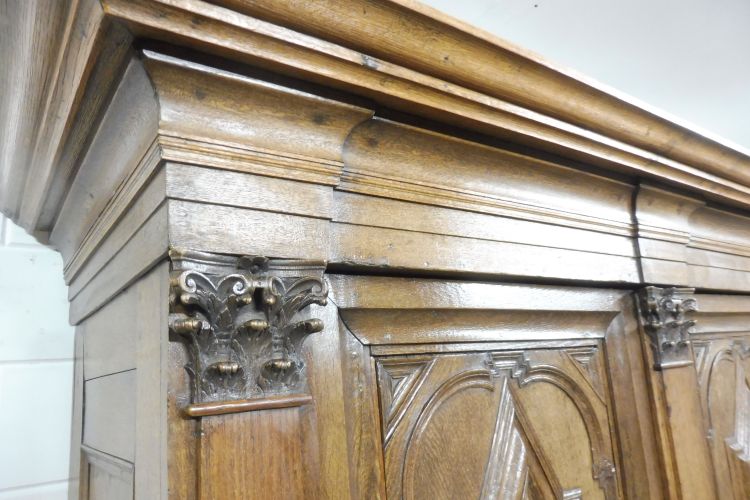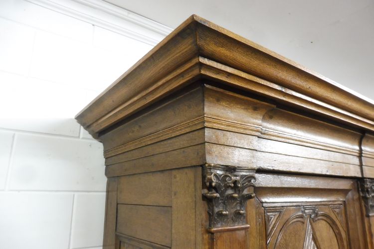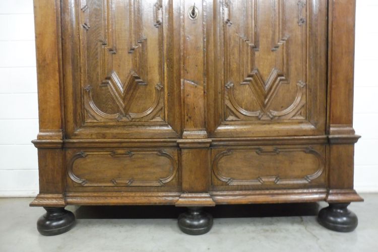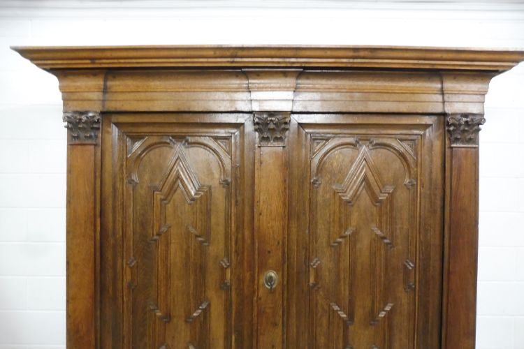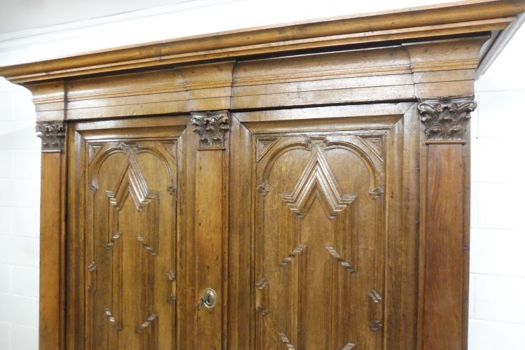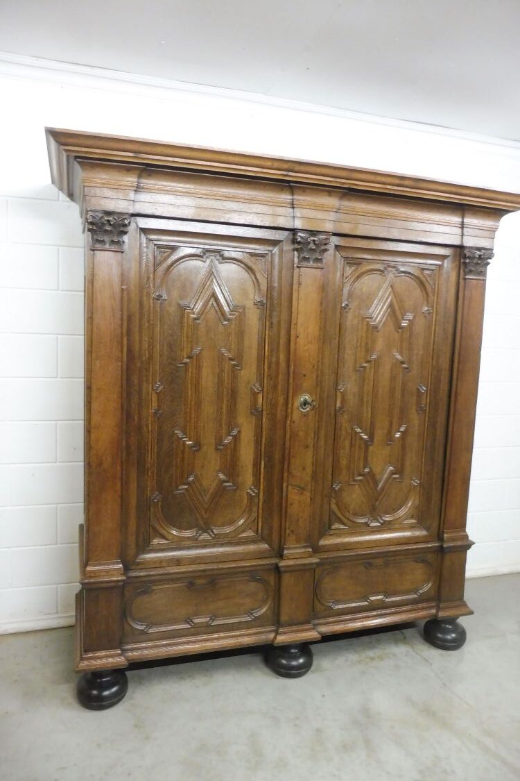 Zeer mooie antieke barokke kast van massief eikenhout ca. 1750. Volledig gerestaureerd en behandeld met was. Volledig demonteerbaar. Klaar voor gebruik. Door de leeftijd vertoont de kast enkele gebruikssporen. Hoogte 211 cm Breedte 201 cm Diepte 74 cm Binnen diepte 46 cm