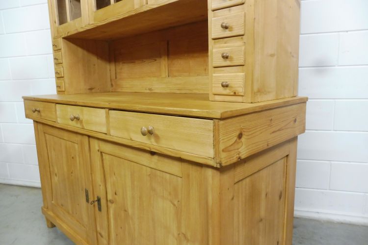 Prachtige antieke buffetkast van vurenhout, Gründerzeit rond 1880. Volledig gerestaureerd en behandeld met was. Demontabel in 2 delen. In direct bruikbare staat.