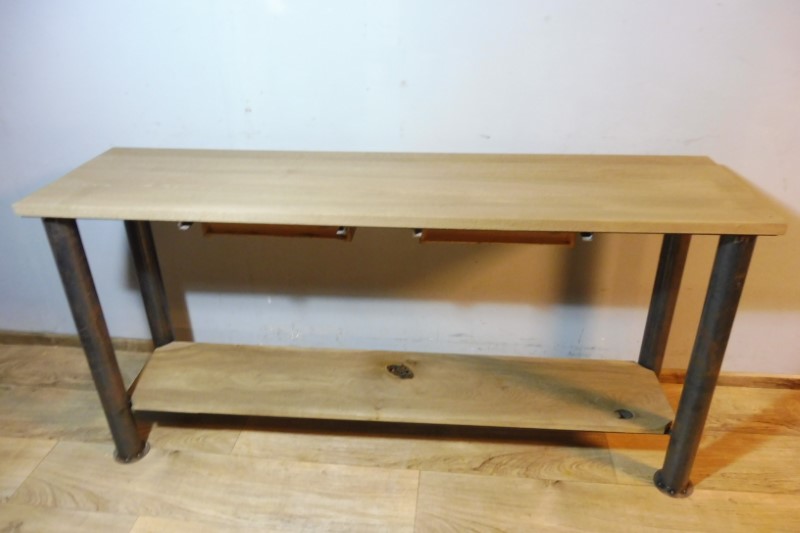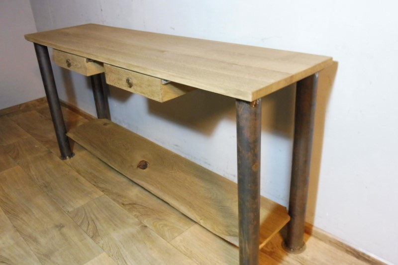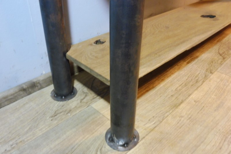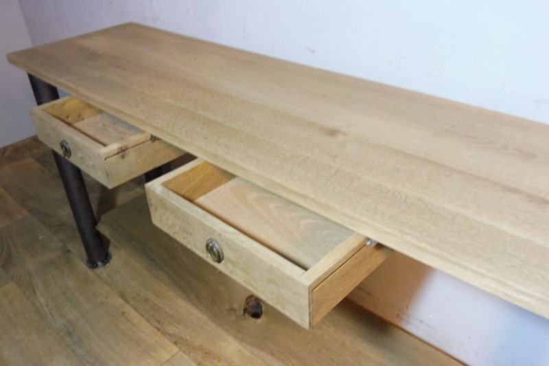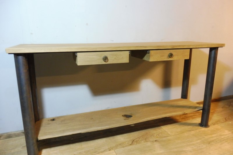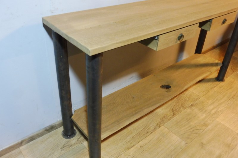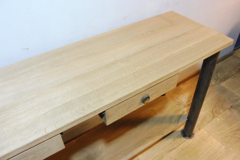 Prachtige industriële designtafel (Nieuw). Tafelblad is massief eiken en behandeld met olie. Hoogte 88 cm – Breedte 178 cm – Diepte 54 cm