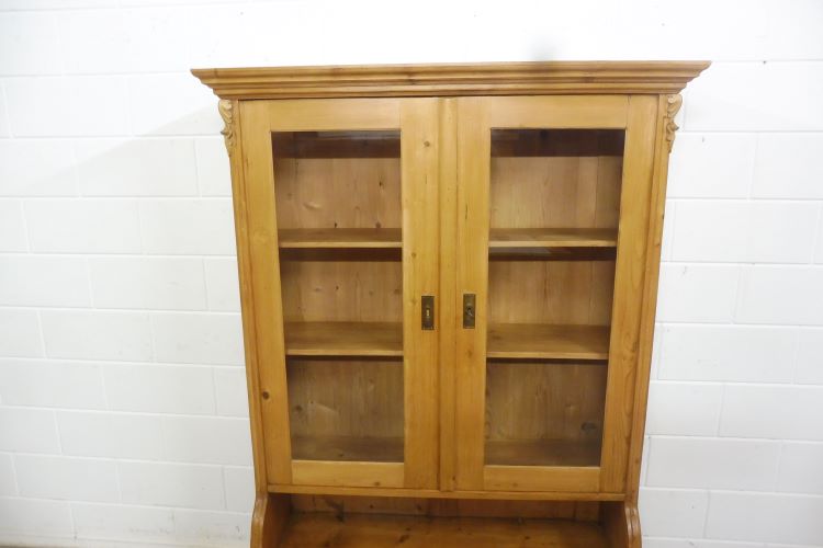 Prachtige antieke buffetkast van vurenhout, Gründerzeit rond 1880. Volledig gerestaureerd en behandeld met was. Demontabel in 2 delen. In direct bruikbare staat. Hoogte 219 cm Breedte 129 cm Diepte 63 cm