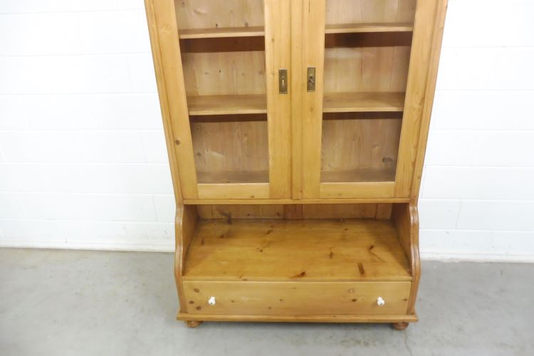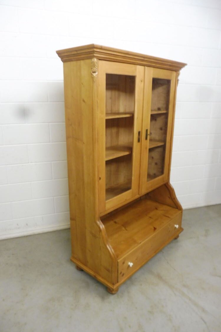 Mooie vitrinekast van grenenhout. Gerestaureerd en behandeld met was. In woonklare staat. Hoogte 179 cm Breedte 120 cm Diepte 50 cm Diepte binnen 26 cm