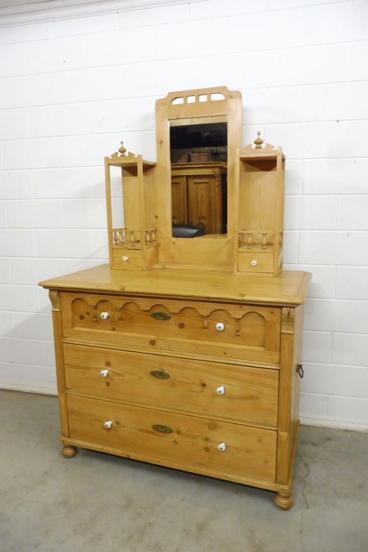 Schöne Antike Kommode aus Weichholz um 1900. Restauriert und behandelt mit wachs. Wohnfertigen Zustand. Höhe mit Aufsatz 199cm Höhe ohne Aufsatz 101cm Breite 127cm Tiefe 64cm