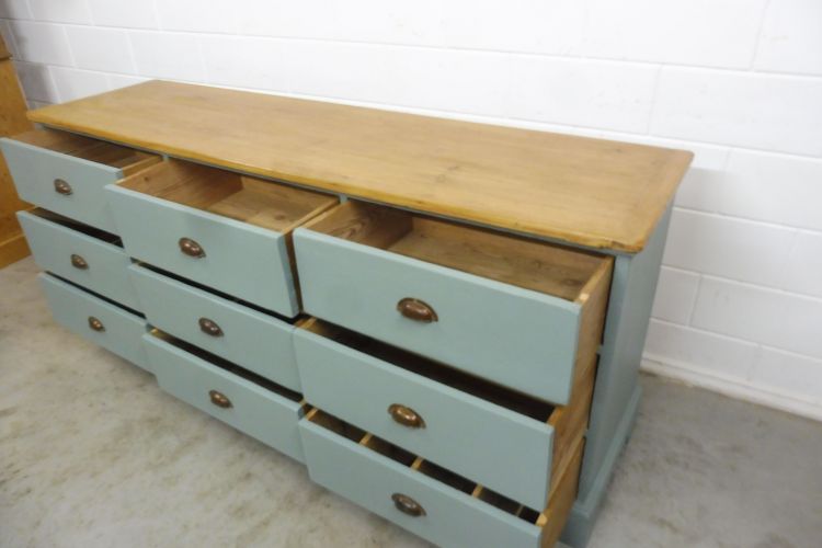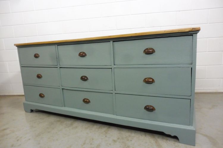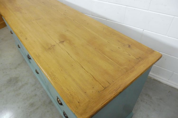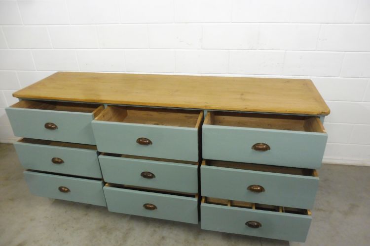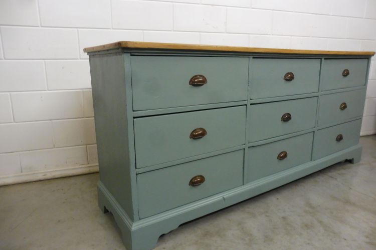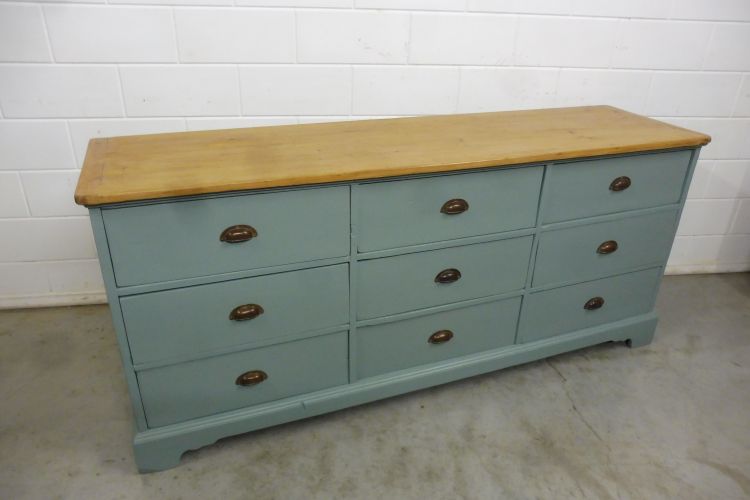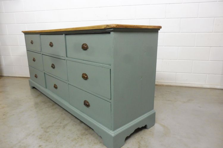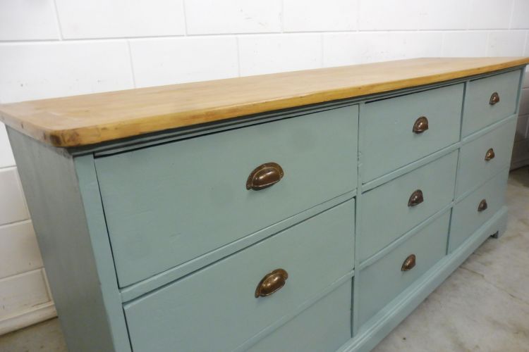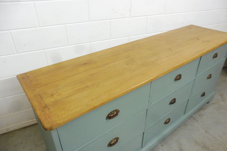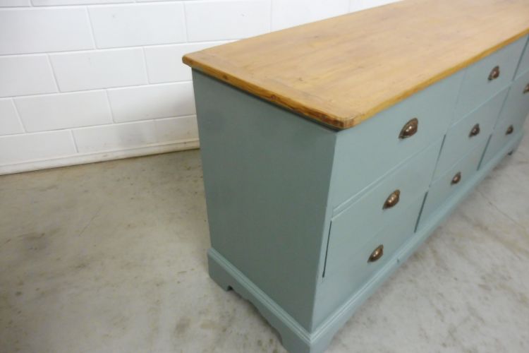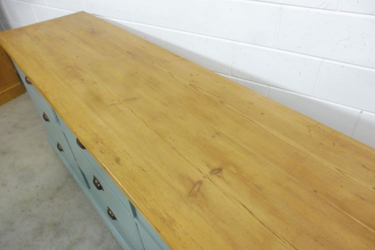 Schöner antiker Apothekerschrank aus Weichholz hellgrün. Komplett restauriert. Wohnfertigen Zustand. Höhe 88cm Breite 199cm Tiefe 88cm