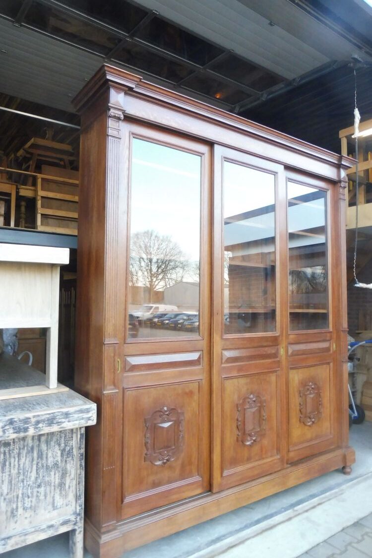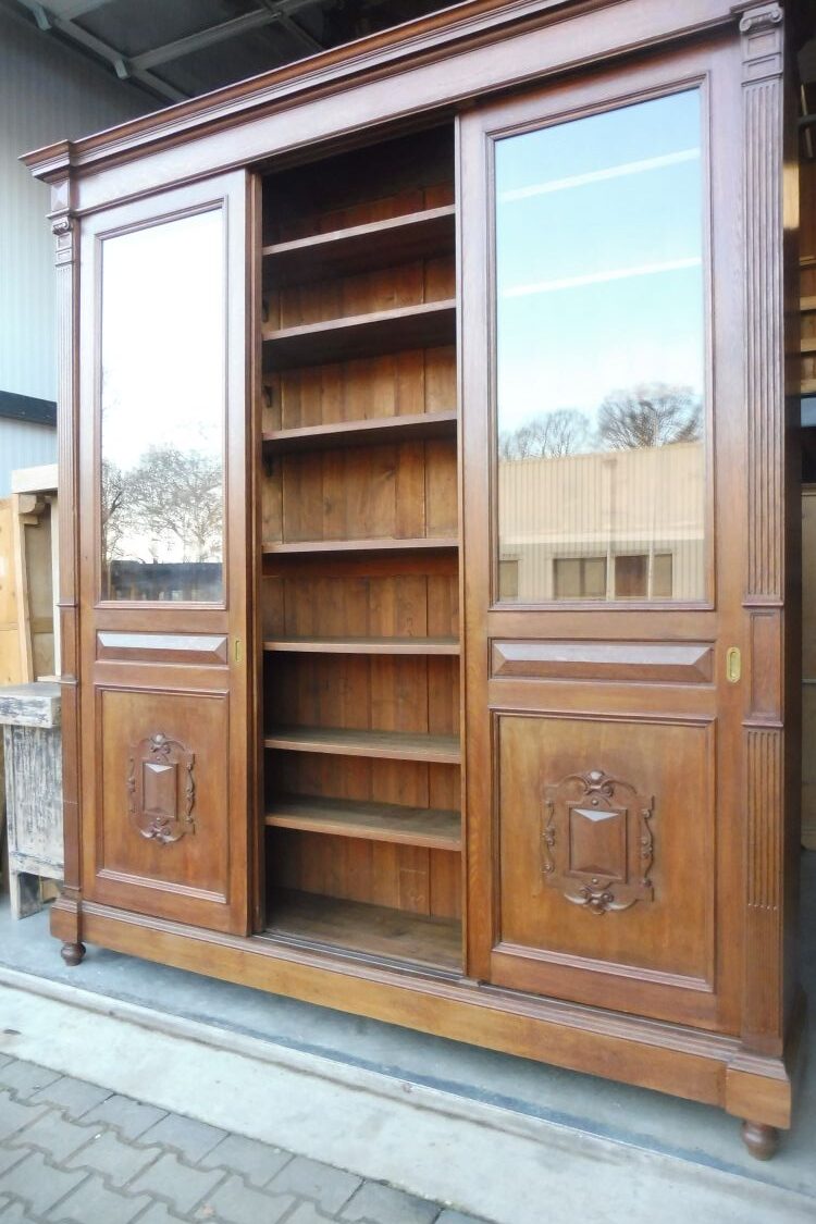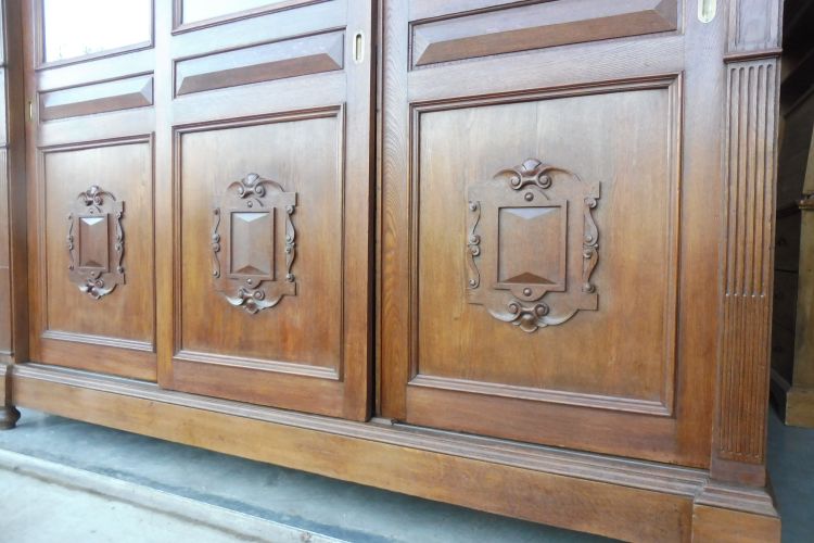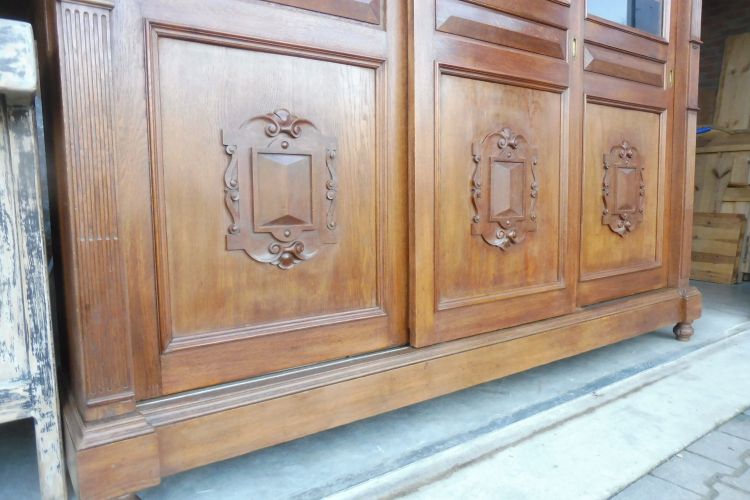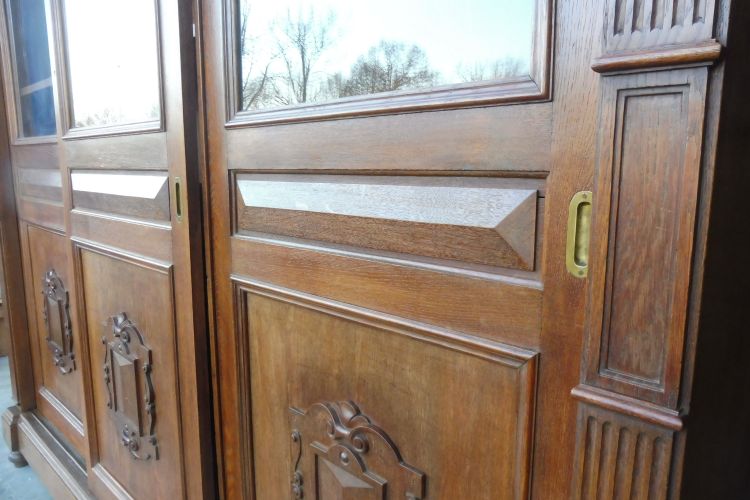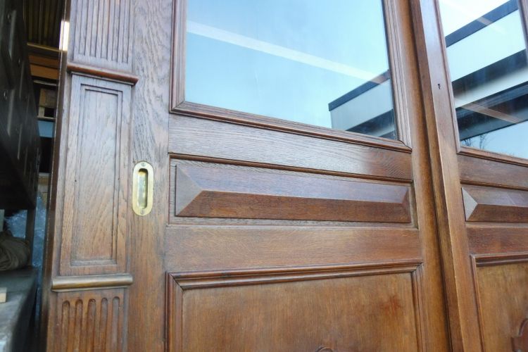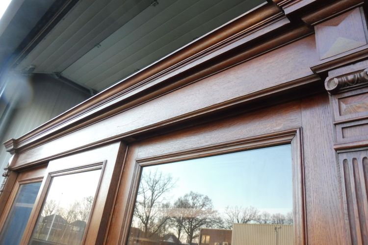 Sehr großer antiker Vitrinenschrank aus massiv Eiche um 1880 Gründerzeit. Komplett restauriert und behandelt mit wachs. Wohnfertigen Zustand. Komplett zerlegbar.